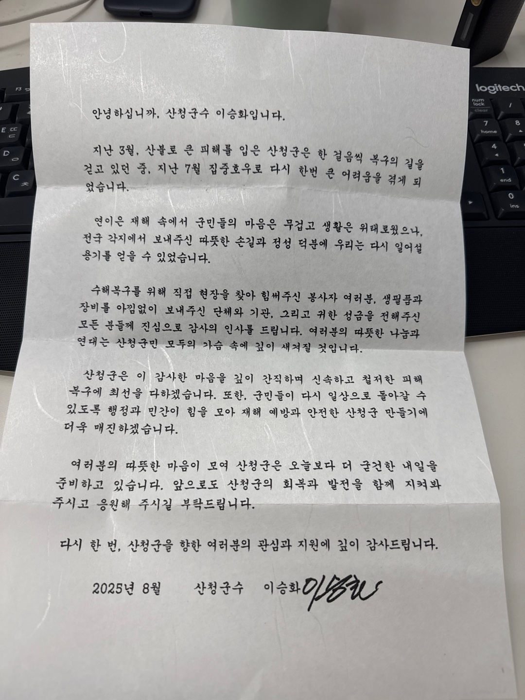 특히 이번 활동에 대해 이승화 산청군수님으로부터 감사의 편지를 전달받았습니다.