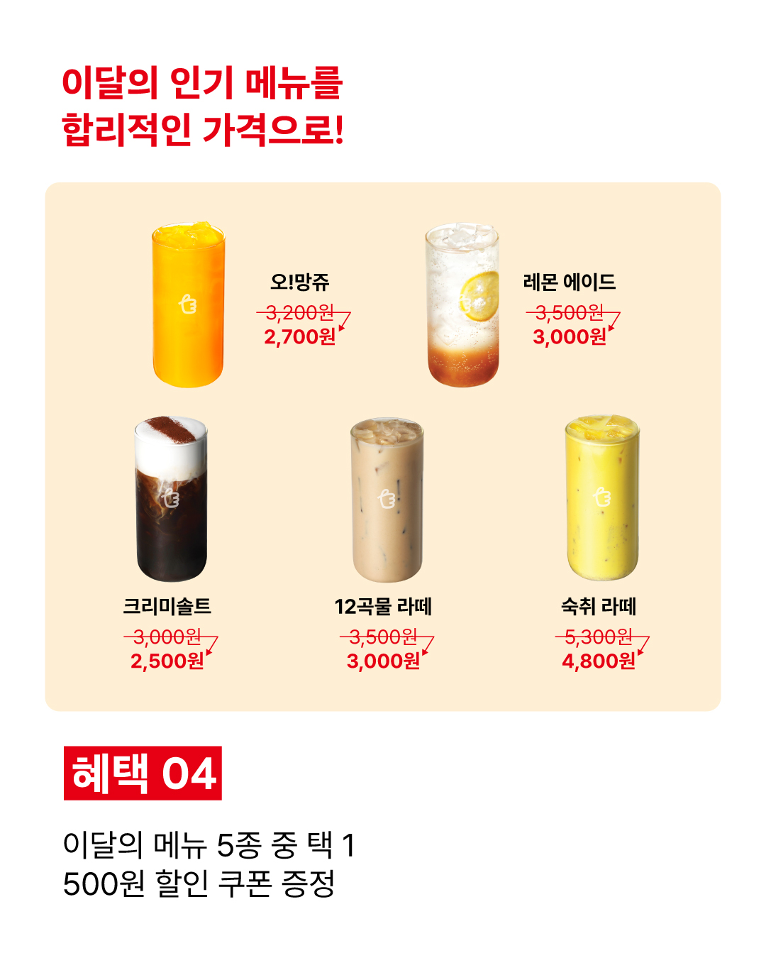 혜택 4️⃣ 이 달의 메뉴 5종 500원 할인 쿠폰